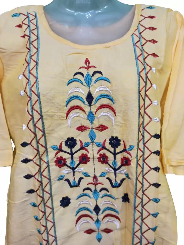 Ideal For:Women Length Type:Knee Length Brand Color:Yellow Occasion:Casual Pattern:Embroidered Type:Straight Fabric:Cotton Blend Neck:Round Neck Sleeve:3/4 Sleeve