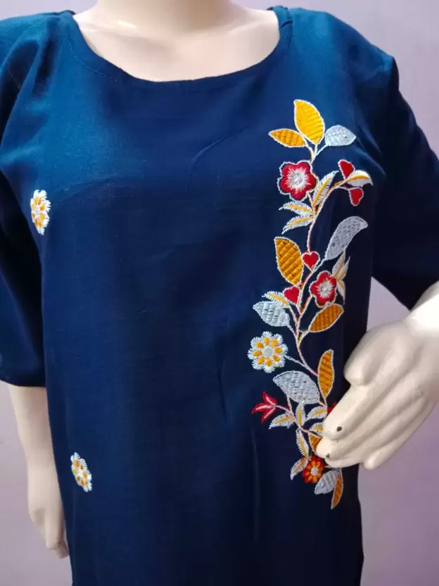 Ideal For:Women Length Type:Above Knee Brand Color:blue Occasion:Casual Pattern:Embroidered Type:A-line Fabric:Cotton Linen Neck:Round Neck Sleeve:3/4 Sleeve Color:Blue Number of Contents in Sales Package:Pack of 1